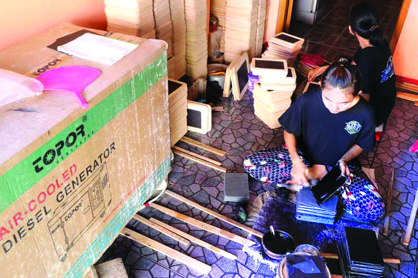 ဖြေ။ ။ ပစ္စည်းအမျိုးအစား ၁၀ မျိုးခန့် ထုတ်လုပ်ပါတယ်။ ကျောက်သင်ပုန်းပန်းချီ၊ ကျောက်သင်ပုန်းနာရီ၊ ကြော်ငြာအမျိုးမျိုး၊ ဖိတ်စာအမျိုးမျိုး၊ နှစ်ပတ်လည်အထိမ်းအမှတ်၊ အစားအသောက်မီနူးများ စတဲ့ပစ္စည်းတွေကို ထုတ်လုပ်ပါတယ်။ နှစ်ပတ်လည်အထိမ်း အမှတ်ပစ္စည်းမျိုး ကျောင်းတွေကမှာရင် ထောင်ချီပြီးရောင်းရပါတယ်။ မင်္ဂလာဖိတ်စာဆိုရင် သူတို့ဖိတ်ကြားတဲ့ အရေအတွက်လောက် ဆောင်ရွက်ပေးရပါတယ်။ နာရီတွေလည်း ရောင်းအား ကောင်းပါတယ်၊ စားသောက်ဆိုင်တွေမှာရနိုင်တဲ့ အစားအသောက်မီနူး ကြော်ငြာတွေရေးရ တာမျိုးလည်းရှိပြီး အလှဆင်တဲ့ ပုံတွေ မှာတာမျိုးလည်းရှိပါတယ်။