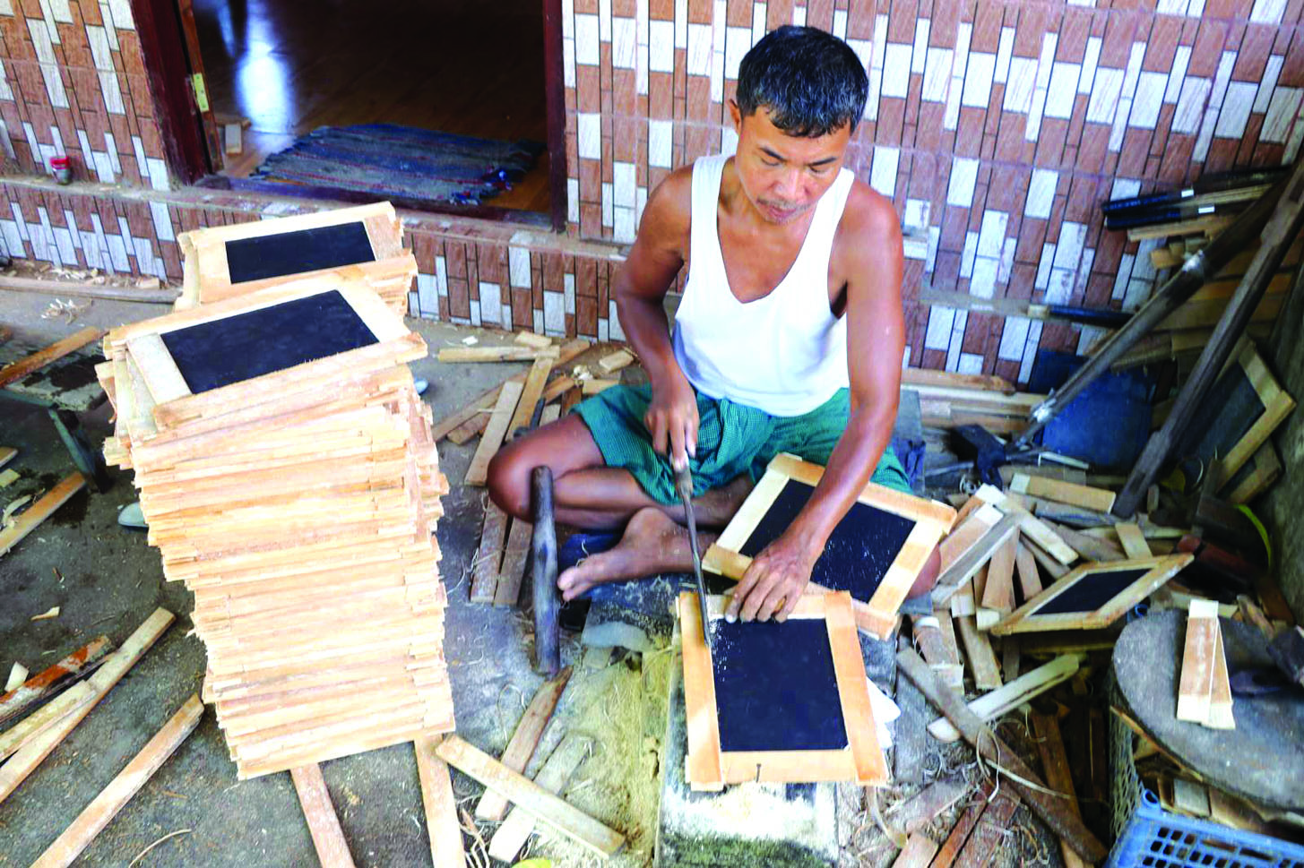 ဖြေ။ ။ ကျောက်သင်ပုန်းလုပ်ငန်းကို မျိုးရိုးစဉ်ဆက် အဘိုး အဘွား၊ အဖေအမေ ကစပြီး အခုအချိန်ထိ လုပ်ခဲ့တာ နှစ်ပေါင်း ၄၀ ကျော်ခဲ့ပါပြီ။ ကုန်ကြမ်းကို အရင်က မုဒွန်းကျေးရွာ ကျောက်သင်ပုန်းတောင်ကရရှိပါတယ်။ အနည်ကျကျောက်ကနေ အသွင်ပြောင်းတဲ့ သင်ပုန်းကျောက်အမျိုးအစားပါ။ ကျောက်သား အနည်းငယ်ပွလို့ ရွေဖော်ထိုးပြီး ဆောင်ရွက် ရပါတယ်။ နောက်ပိုင်း ကုန်ကြမ်းထုတ်လုပ်မှု ကုန်ကျစရိတ်များလာလို့ ကျောက်တွင်းကို ရပ်နားလိုက်ပြီး ပေါင်မြို့နယ် ရင်းငြိမ်ဘက်ကထွက်တဲ့ သင်ပုန်း ကျောက်ကို ဝယ်ယူပြီး ဆောင်ရွက်တာပါ။ ရင်းငြိမ်ဘက်ကထွက်တဲ့ ကျောက်က သံဓာတ်ပါဝင်မှုများတဲ့အတွက် ကျောက်သားမာလို့ ကျောက်စက်နဲ့တိုက်ပြီး ဆောင်ရွက်ရပါတယ်။ ပိုမို ခိုင်ခံ့မှုရှိပါတယ်။ ကုန်ကျစရိတ်လည်း ကွာခြားမှုမရှိပါဘူး။