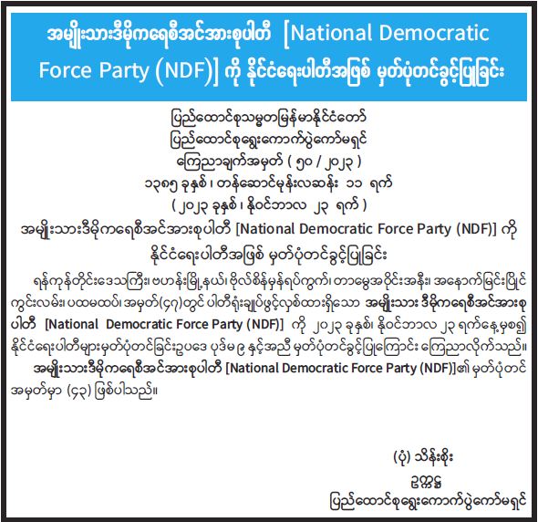 အမျိုးသားဒီမိုကရေစီအင်အားစုပါတီ [National Democratic Force Party (NDF)] ကို နိုင်ငံရေးပါတီအဖြစ် မှတ်ပုံတင်ခွင့်ပြုခြင်း 11/24/2023