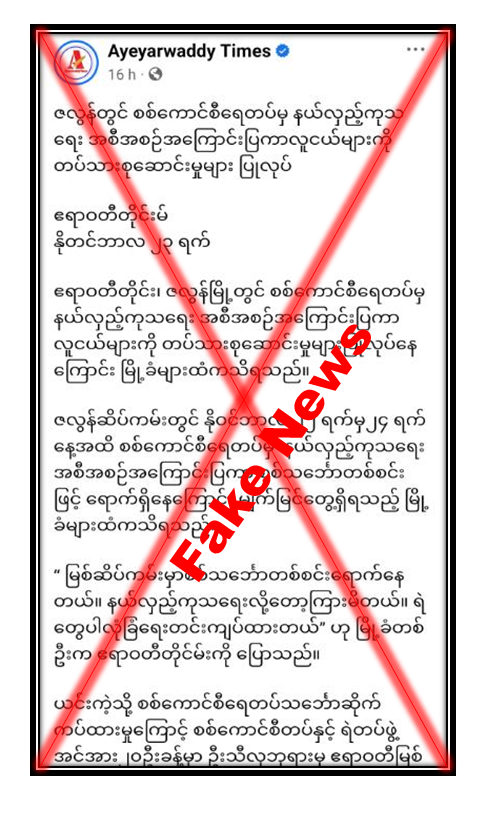 ဧရာဝတီတိုင်းဒေသကြီး၊ ဇလွန်မြို့တွင် နယ်လှည့်ဆေးကုသရေးလာရောက်သည့် စစ်သင်္ဘောမှ ဇလွန်မြို့ရှိ လူငယ်များအား တပ်သားစုဆောင်းမှုများပြုလုပ်နေသည်ဟု ပြည်ဖျက်မီဒီယာတစ်ခုဖြစ်သည့် Ayeyarwaddy Times မီဒီယာမှ လူမှုကွန်ယက်စာမျက်နှာပေါ်တွင် မဟုတ်မမှန်သတင်းများ ရေးသားဖော်ပြလျက်ရှိသည်ကို တွေ့ရှိရသည်။