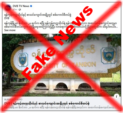 ရန်ကုန်မြို့တွင် နိုဝင်ဘာလ ၂၀ ရက်နေ့က စ၍ ရန်ကုန်တက္ကသိုလ်နှင့် အခြေခံပညာအထက်တန်းကျောင်းများတွင် လုံခြုံရေးတပ်ဖွဲ့ဝင်များက လုံခြုံရေးအကြောင်းပြပြီး လာရောက်တပ်စွဲထားကြောင်း မြို့ခံတွေဆီက သိရှိရတယ်လို့ မဟုတ်မမှန်သတင်းများ လူမှုကွန်ရက်စာမျက်နှာများတွင် ရေးသားဖြန့်ဝေလျက်ရှိကြောင်း တွေ့ရှိရသည်။
