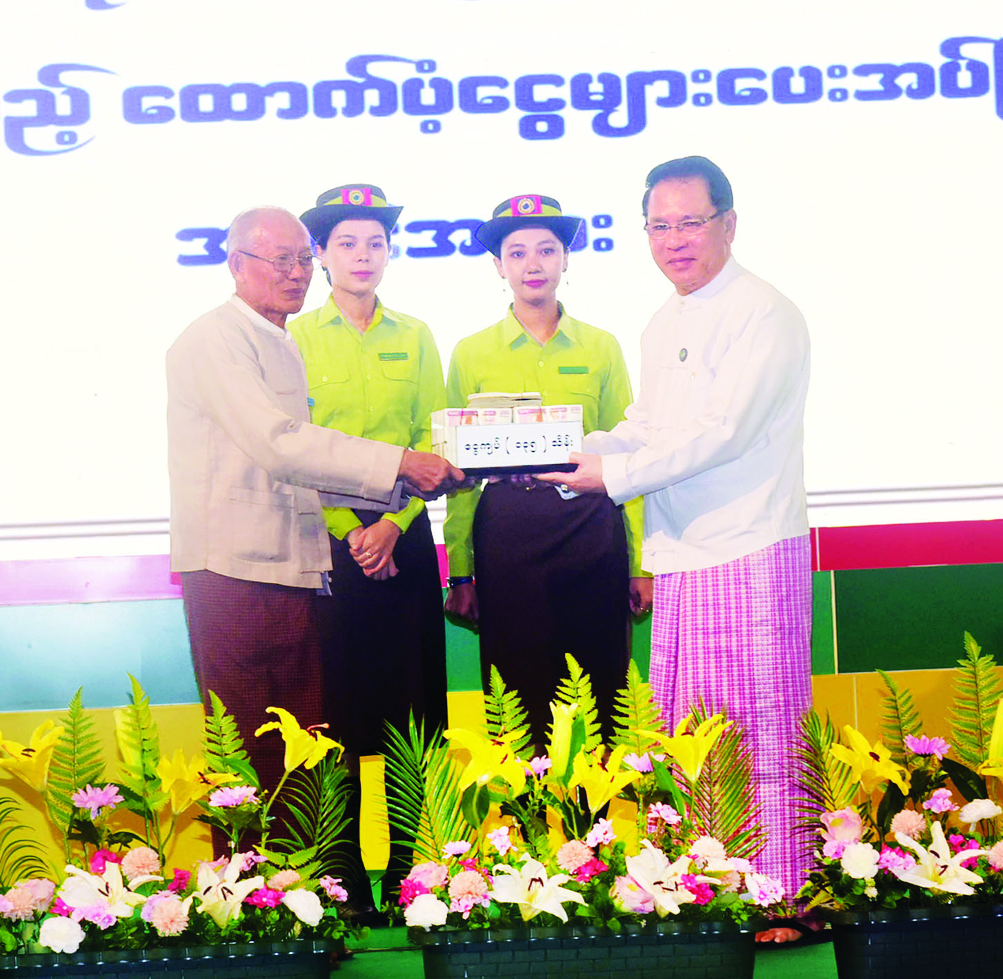 ထို့နောက် ရန်ကုန်တိုင်းဒေသကြီးဝန်ကြီးချုပ်ဦးစိုးသိန်းက ထောက်ပံ့ငွေများ ပေးအပ်သည်။