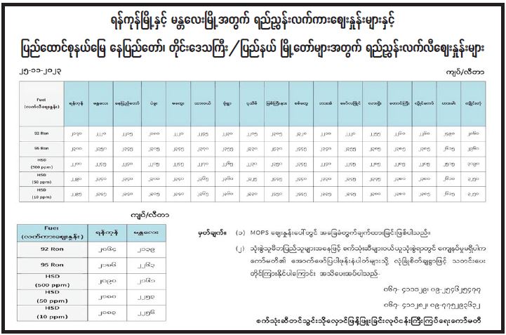 ရန်ကုန်မြို့နှင့် မန္တလေးမြို့အတွက် ရည်ညွှန်းလက်ကားဈေးနှုန်းများနှင့် ပြည်ထောင်စုနယ်မြေ နေပြည်တော်၊ တိုင်းဒေသကြီး/ ပြည်နယ် မြို့တော်များအတွက် ရည်ညွှန်းလက်လီဈေးနှုန်းများ 11/25/2023