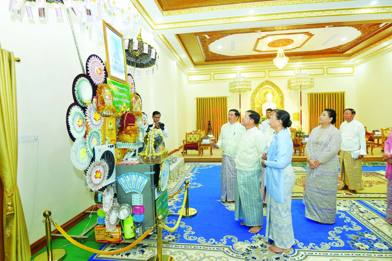 ထို့နောက် နိုင်ငံတော်စီမံအုပ်ချုပ်ရေးကောင်စီဥက္ကဋ္ဌ နိုင်ငံတော်ဝန်ကြီးချုပ်နှင့် အခမ်းအနားတက်ရောက်လာသည့် ဧည့်ပရိသတ်များသည် ကထိန်ခံမာရဝိဇယ ကျောင်းတော်ကြီးသို့ လှူဒါန်းရန်ခင်းကျင်းပြင်ဆင်ထားသည့် ကထိန်လျာသင်္ကန်း၊ လှူဖွယ် ပစ္စည်းများနှင့် ပဒေသာပင်များအား လှည့်လည်ကြည့်ရှုကြသည်။