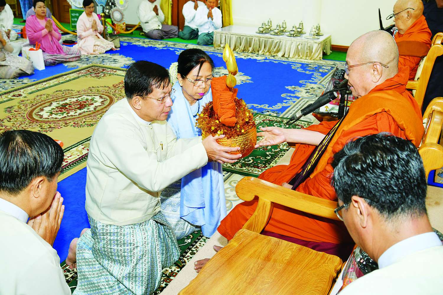 ထို့နောက် နိုင်ငံတော်စီမံအုပ်ချုပ်ရေးကောင်စီဥက္ကဋ္ဌ နိုင်ငံတော်ဝန်ကြီးချုပ်နှင့် ဇနီးတို့သည် ပေါက်မြိုင်ဆရာတော်ကြီးထံ ကထိန်သင်္ကန်းနှင့် လှူဖွယ်ပစ္စည်းများကို လည်းကောင်း၊ ကထိန်အလှူခံကျောင်း မာရဝိဇယကျောင်းတော် ကျောင်းထိုင်ဆရာတော် အဂ္ဂမဟာပဏ္ဍိတ ဘဒ္ဒန္တနေမိန္ဒထံ ကထိန်လျာသင်္ကန်းနှင့် လှူဖွယ်ပစ္စည်းများကို လည်းကောင်း ဆက်ကပ်လှူဒါန်းသည်။