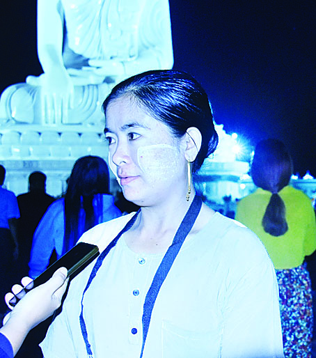 ကျွန်မက မာရဝိဇယဘုရားကြီးကို အရင်ကလည်း လာရောက်ဖူးမြော်ဖူးပါတယ်။ ဒီနေ့မှာတော့ ရွာမှာရှိတဲ့သူတွေနဲ့ စုပေါင်းပြီး လာရောက်ဖူးမြော်တာ ဖြစ်ပါတယ်။ ဘုရားကြီးမှာ ဆီမီး ၉၀၀၀ ထွန်းညှိပူဇော်ပြီး ထူးထူးခြားခြား မီးပုံးပျံလွှတ်တင်မယ်လို့ ကြားသိရလို့ လာရောက်တာဖြစ်ပါတယ်။ အခု ဘုရားဖူးပြီးသွားရင် ဈေးအရောင်းဆိုင်ခန်းတွေနဲ့ တေးဂီတဖျော်ဖြေပွဲတွေကို သွားကြည့်မှာ ဖြစ်ပါတယ်။ ဘုရားကြီးကို အရင်က နေ့ခင်းဘက်တွေပဲ လာရောက်ဖူးမြော်တာ ဖြစ်ပါ တယ်။ အခုလို ညဘက်ကြီး လာရောက်ဖူးမြော်ရတော့ ပိုပြီးပီတိဖြစ်ရပါတယ်။ ဘုရားကြီးနဲ့ မီးပုံးပျံတွေနဲ့ ပနံတင့်ပြီး ကြည်ညိုလို့မဆုံး ဖြစ်မိပါတယ်။