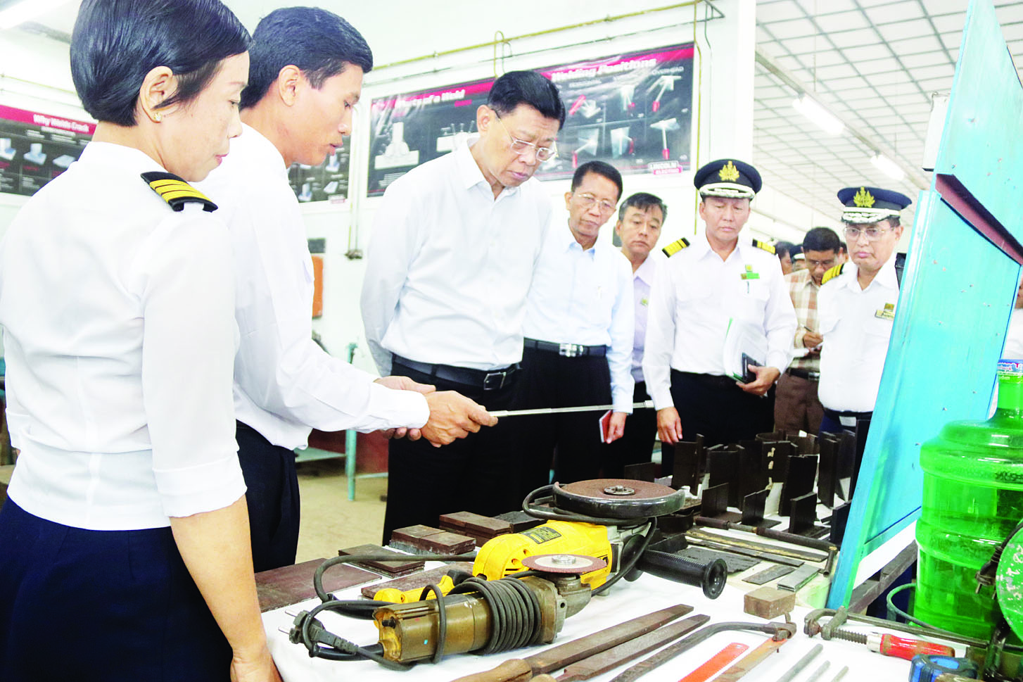 တင်ပြချက်များအပေါ် ပြည်ထောင်စုဝန်ကြီးက ဝန်ထမ်းများ ကျွမ်းကျင်မှုပိုမိုမြင့်မားလာရေးနှင့် စွမ်းဆောင်မှု စဉ်ဆက်မပြတ် တိုးတက်စေရေးအတွက် လိုအပ်ချက်များကိုမှာကြားပြီး စက်ရုံရှိ စက်မှုသင်တန်းကျောင်း၌ သင်တန်းပို့ချလေ့ကျင့်ပေးမှု နည်းစနစ်၊ သင်တန်းဆိုင်ရာ စာအုပ်စာတမ်းများ၊ သင်ကြား လေ့ကျင့်ရေးတွင် အသုံးပြုနေသည့် စက်ကိရိယာပစ္စည်းများနှင့် သင်တန်းခန်းမတို့ကို လှည့်လည်ကြည့်ရှုစစ်ဆေးသည်။