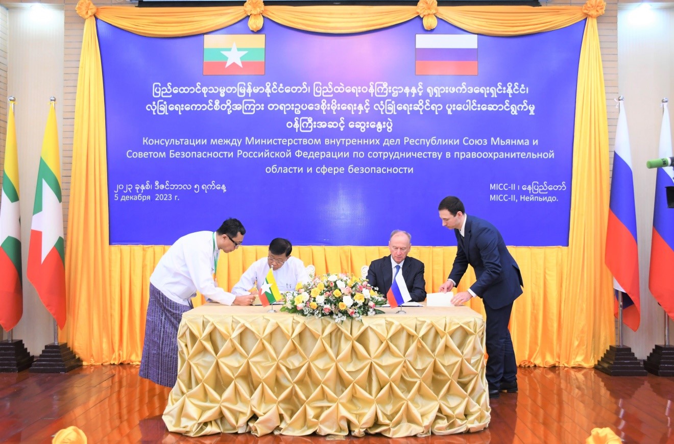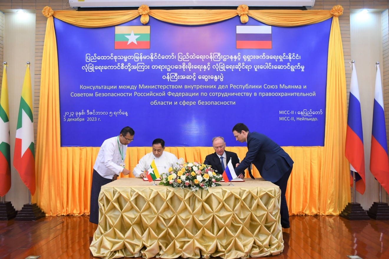 ထို့နောက် ပြည်ထောင်စုသမ္မတမြန်မာနိုင်ငံတော်နှင့် ရုရှားဖက်ဒရေးရှင်းနိုင်ငံ အစိုးရတို့အကြား အပြည်ပြည်ဆိုင်ရာသတင်းအချက်အလက် လုံခြုံရေးကဏ္ဍတွင် ပူးပေါင်းဆောင်ရွက်ရေးဆိုင်ရာ သဘောတူညီချက်ကို နိုင်ငံတော်စီမံအုပ်ချုပ်ရေးကောင်စီအဖွဲ့ဝင်၊ ဒုတိယဝန်ကြီးချုပ်၊ ပို့ဆောင်ရေးနှင့်ဆက်သွယ်ရေးဝန်ကြီးဌာန ပြည်ထောင်စုဝန်ကြီး ဗိုလ်ချုပ်ကြီးမြထွန်းဦးနှင့် ရုရှားဖက်ဒရေးရှင်းနိုင်ငံ လုံခြုံရေးကောင်စီအတွင်းရေးမှူး မစ္စတာနီကိုလိုင်းပတ်ထရူးရှက်ဖ်တို့က လက်မှတ်ရေးထိုးခဲ့ကြပြီး အမှတ်တရလက်ဆောင်ပစ္စည်းများ အပြန်အလှန်ပေးအပ်ခဲ့ကာ စုပေါင်းမှတ်တမ်းတင် ဓါတ်ပုံရိုက်ကြသည်။