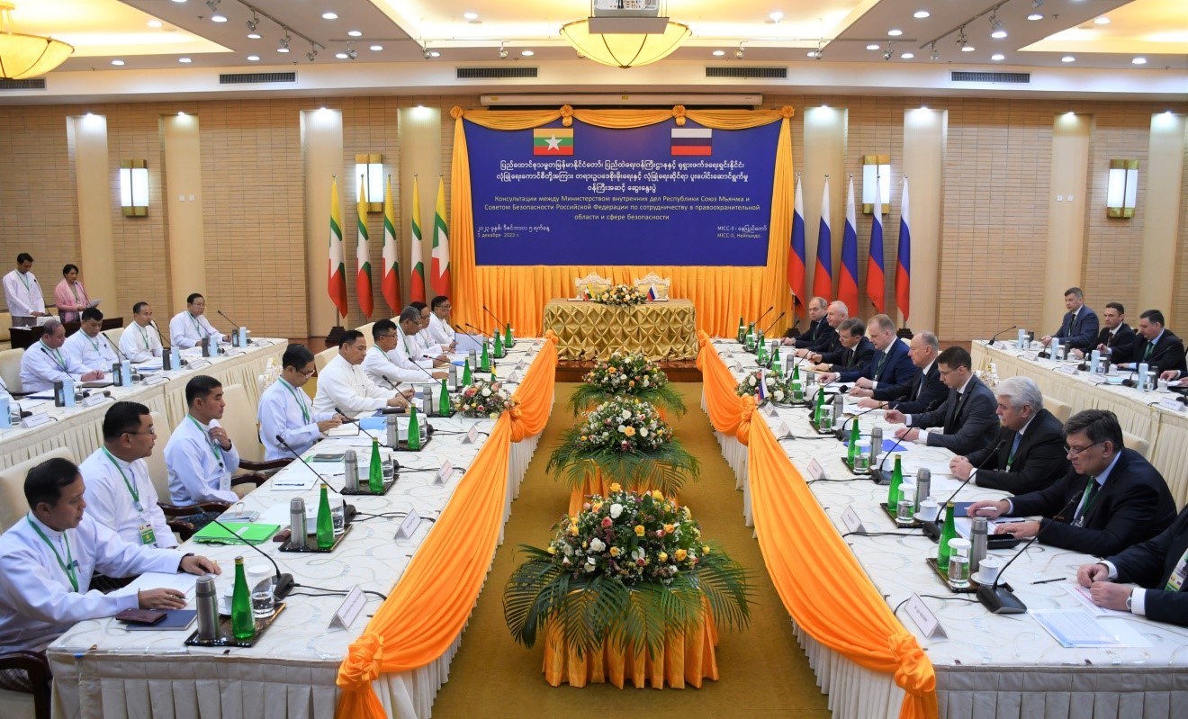 ပြည်ထဲရေးဝန်ကြီးဌာနနှင့် ရုရှားဖက်ဒရေးရှင်းနိုင်ငံ လုံခြုံရေးကောင်စီတို့အကြား တရားဥပဒေစိုးမိုးရေးနှင့် လုံခြုံရေးဆိုင်ရာ ပူးပေါင်းဆောင်ရွက်မှုဝန်ကြီးအဆင့်ဆွေးနွေးပွဲကို ယနေ့နံနက် ၉ နာရီခွဲတွင် နေပြည်တော်ရှိ မြန်မာအပြည်ပြည်ဆိုင်ရာ ကွန်ဗင်းရှင်းဗဟိုဌာန-၂ (MICC II) ၌ ကျင်းပသည်။