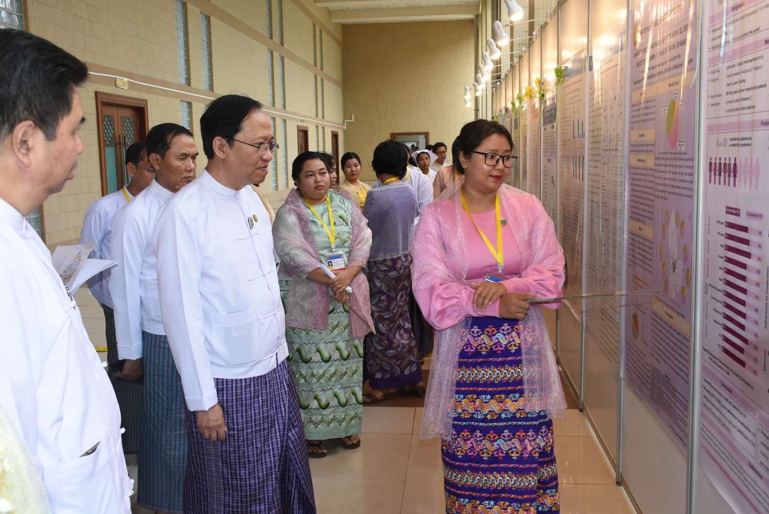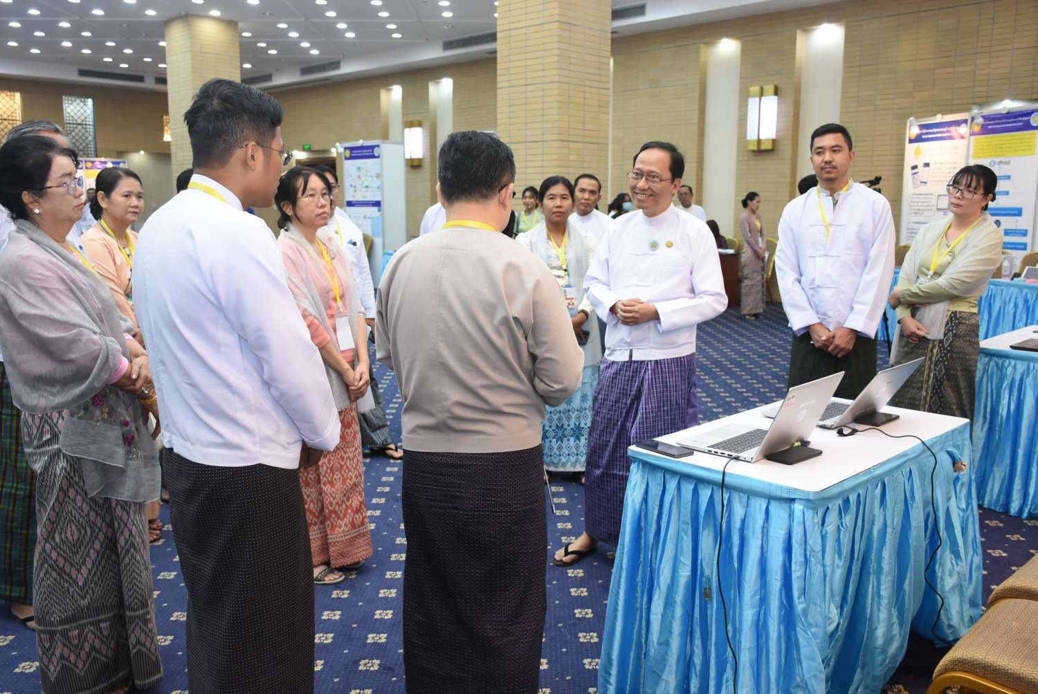 မြန်မာနိုင်ငံ ပြည်သူ့ကျန်းမာရေးပညာရပ်ဆိုင်ရာ နှီးနှောဖလှယ်ပွဲ (၂၀၂၃) ကို နေပြည်တော်ရှိ မြန်မာအပြည်ပြည်ဆိုင်ရာကွန်ဗင်းရှင်းဗဟိုဌာန-၂(MICC-2) ၌ ဒုတိယနေ့ ဆက်လက်ကျင်းပရာ ကျန်းမာရေးဝန်ကြီးဌာန ပြည်ထောင်စုဝန်ကြီး ပါမောက္ခ ဒေါက်တာ သက်ခိုင်ဝင်းနှင့်အဖွဲ့သည် ပြည်သူ့ကျန်းမာရေးဆိုင်ရာ ပိုစတာ(၂၇)စောင်ကို ကြည့်ရှုအားပေးရာ စာတမ်းရှင်များက ရှင်းလင်းတင်ပြကြသည်။