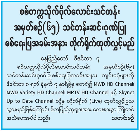 စစ်တက္ကသိုလ်ဗိုလ်လောင်းသင်တန်း အမှတ်စဉ် (၆၅) သင်တန်းဆင်းဂုဏ်ပြု စစ်ရေးပြအခမ်းအနား တိုက်ရိုက်ထုတ်လွှင့်မည် 12/08/2023