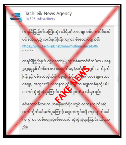 ကယားပြည်နယ်၊ လွိုင်ကော်မြို့ရှိ သီရိမင်္ဂလာဈေးအတွင်းသို့ ယနေ့နံနက်ပိုင်းက တပ်မတော်မှ လက်နက်ကြီးများဖြင့် ပစ်ခတ်ခဲ့မှုကြောင့် ဈေးတစ်ခုလုံး မီးလောင်ဆုံးရှုံးခဲ့ရကြောင်း တရားမဝင် ပြည်ဖျက်မီဒီယာများက မဟုတ်မမှန်သတင်းအမှားများကို လူမှုကွန်ရက်စာမျက်နှာများတွင် ရေးသားဖြန့်ဝေလျက်ရှိသည်ကို တွေ့ရှိရသည်။