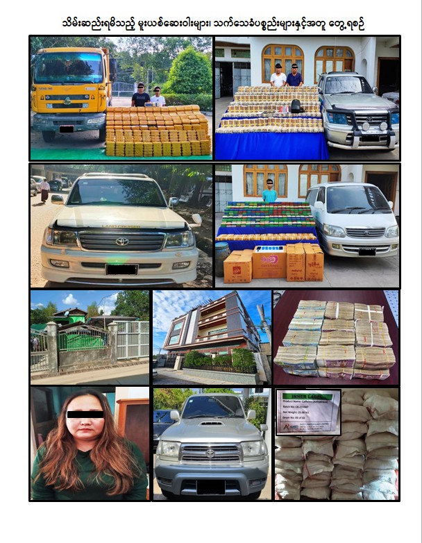 နေပြည်တော်ကောင်စီနယ်မြေ၊ လယ်ဝေးမြို့နယ်၊ တောင်စဉ်အေးကျေးရွာအနီး၌ ဒီဇင်ဘာလ ၁ ရက် ည ၇ နာရီခန့်တွင် တင်ဇော်လတ်မောင်းနှင်၍ ကျော်စန်းဌေးလိုက်ပါလာသည့် CHENGLONG TIPPER မော်တော်ယာဉ်ကို မူးယစ်ဆေးဝါးတားဆီးနှိမ်နင်းရေး ရဲတပ်ဖွဲ့မှ တပ်ဖွဲ့ဝင်များပါဝင်သော ပူးပေါင်းအဖွဲ့က သတင်းအရရှာဖွေရာ ယာဉ်ပေါ်တွင် ဘိလပ်မြေအိတ်များဖြင့် ဖုံးအုပ်သယ်ဆောင်လာသည့် စိတ်ကြွရူးသွပ်ဆေးပြား ၄၂ သိန်း တွေ့ရှိခဲ့ပြီး စစ်ဆေးဖော်ထုတ်ချက်အရ စိတ်ကြွရူးသွပ်ဆေးပြားများ တာဝန်ခံသယ်ဆောင်သူထန်ခိုဆေးအား ယင်းနေ့ ည ၁၁ နာရီခန့်တွင် မန္တလေးတိုင်းဒေသကြီး၊ ချမ်းအေးသာစံမြို့နယ်၊ ၂၇ x ၂၈ ကြား၊ ၆၃ (C)လမ်းရှိ Hotel တွင် ဖမ်းဆီးရမိခဲ့၍ ရန်ကုန်တိုင်းဒေသကြီး၊ မှော်ဘီမြို့နယ်၊ တပ်ကြီးကုန်းကျေးရွာရှိ ၎င်း၏နေအိမ်မှ မူးယစ်ဆေးဝါး သယ်ဆောင်ရောင်းဝယ်ရာတွင် အသုံးပြုသည့် TOYOTA LANDCRUISER မော်တော်ယာဉ် ၁ စီးနှင့် မူးယစ်ဆေးဝါးသယ်ဆောင်ရောင်းဝယ်ရာမှရရှိသည့် ငွေကျပ် ၁,၂၀၂ သိန်း သိမ်းဆည်းရမိခဲ့ကြောင်း၊ ကွင်းဆက်ဖော်ထုတ်ချက်အရ ဒီဇင်ဘာလ ၂ ရက် နံနက် ၄ နာရီအချိန် ချမ်းအေးသာစံမြို့နယ်၊ အောင်နန်း(အရှေ့)ရပ်ကွက်နေ ဝင်းအောင်အား စိတ်ကြွရူးသွပ်ဆေးပြား ၁၈ သိန်း၊ PRADO မော်တော်ယာဉ် ၁ စီးနှင့်အတူ ဆက်လက်ဖမ်းဆီးရမိခဲ့ကြောင်း၊ မူးယစ်ဆေးဝါး သယ်ဆောင်ရောင်းဝယ်သည့် ငွေကြေးစီးဆင်းမှုများကို စိစစ်ဖော်ထုတ်ချက်များအရ ဒီဇင်ဘာလ ၅ ရက် နံနက် ၁၀ နာရီခန့်တွင် မန္တလေးတိုင်းဒေသကြီး၊ ပုသိမ်ကြီးမြို့နယ်၊ အိုင်ကြီးကျေးရွာနေ သန်းသန်းထွန်း(ခ)အားစိုင်းအား စိတ်ကြွရူးသွပ်ဆေးပြား ၁ ဒသမ ၇၆ သိန်း၊ ဘိန်းဖြူ ၈ ဒသမ ၈ ကီလို၊ SUPER CUSTOM မော်တော်ယာဉ် ၁ စီးနှင့်အတူ ဖမ်းဆီးရမိခဲ့ပြီး ဒီဇင်ဘာလ ၉ ရက် ညနေ ၃ နာရီခွဲခန့်တွင် စစ်ကိုင်းတိုင်းဒေသကြီး၊ ကလေးမြို့၊ တာဟန်းရပ်ကွက်ရှိ မလားဆန်းခူးမီးအား ထိန်းချုပ်ဓာတုပစ္စည်း ကဖင်း ၃ ဒသမ ၂ တန် နှင့်အတူ ဖမ်းဆီးရမိခဲ့သဖြင့် စစ်ဆေးဖော်ထုတ်ချက်များအရ သိမ်းဆည်းရမိမူးယစ်ဆေးဝါးများအား မူးယစ်မှောင်ခိုဂိုဏ်းဖွဲ့၍ ရှမ်းပြည်နယ်မှ မန္တလေးတိုင်းဒေသကြီးနှင့် ရန်ကုန်တိုင်းဒေသကြီး၊ စစ်ကိုင်းတိုင်းဒေသကြီးတို့သို့ သယ်ဆောင်ရောင်းဝယ်ပြီး စိတ်ကြွရူးသွပ်ဆေးပြား ထုတ်လုပ်ရာတွင် အသုံးပြုသည့် ထိန်းချုပ်ဓာတုပစ္စည်းကဖင်းများကို ကလေးမြို့မှရှမ်းပြည်နယ်သို့ သယ်ဆောင်ရောင်းဝယ်ခြင်းဖြစ်ကြောင်းသိရှိရသဖြင့် ၎င်းမူးယစ်မှောင်ခိုဂိုဏ်းအဖွဲ့အား မူးယစ်ဆေးဝါးနှင့်စိတ်ကို ပြောင်းလဲစေသောဆေးဝါးများဆိုင်ရာဥပဒေအရ အရေးယူထားရှိပြီး ကွင်းဆက်ပြစ်မှုကျူးလွန်သူများအား ဆက်လက်စစ်ဆေးဖော်ထုတ် လျက်ရှိကြောင်းနှင့် အမှုတွင် ဆက်စပ်ပါဝင်သူများနှင့် ၎င်းတို့မ