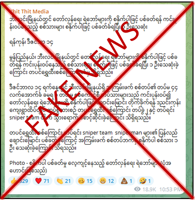 ‌မွန်ပြည်နယ်၊ ဘီးလင်းမြို့၊ ဒညင်းကုန်းကျေးရွာထိပ်တွင် တပ်စွဲထားသော လုံခြုံရေးတပ်ဖွဲ့များအား စနိုက်ပါဖြင့် ပစ်ခတ်တိုက်ခိုက်မှုကြောင့် ၁ ဦး သေဆုံးခဲ့ဟု သတင်းတု၊ သတင်းအမှားများကို လူမှုကွန်ရက်စာမျက်နှာများတွင် ရေးသားဖြန့်ဝေလျက်ရှိ