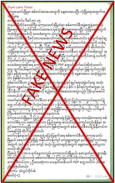 တနင်္သာရီတိုင်းဒေသကြီး၊ ကော့သောင်းမြို့တွင် တပ်မတော်အားပေးသူတွေကို နေ့စားခပေးပြီး လုံခြုံရေးအတွက် အသုံးပြုနေသည်ဟု သတင်းတု၊ သတင်းအမှားများ မဟုတ်မမှန်ရေးသားဖြန့်ဝေလျက်ရှိ