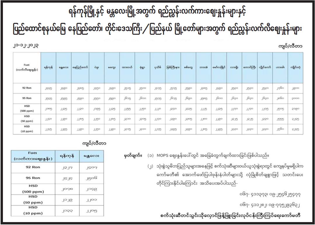 ရန်ကုန်မြို့နှင့် မန္တလေးမြို့အတွက် ရည်ညွှန်းလက်ကားဈေးနှုန်းများနှင့် ပြည်ထောင်စုနယ်မြေ နေပြည်တော်၊ တိုင်းဒေသကြီး/ ပြည်နယ် မြို့တော်များအတွက် ရည်ညွှန်းလက်လီဈေးနှုန်းများ 12/21/2023
