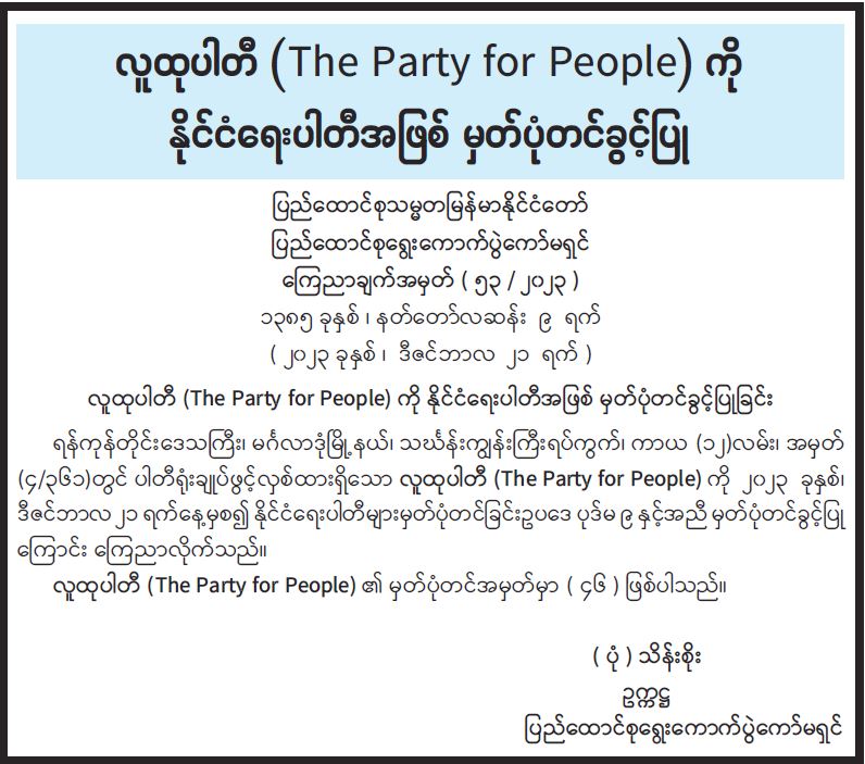 လူထုပါတီ (The Party for People) ကို နိုင်ငံရေးပါတီအဖြစ် မှတ်ပုံတင်ခွင့်ပြု