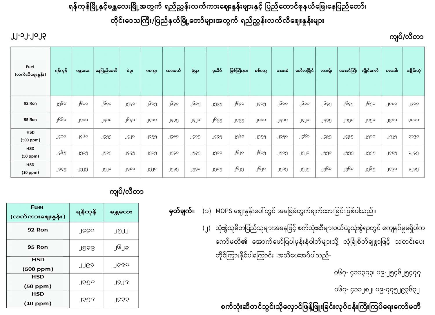 ရန်ကုန်မြို့နှင့် မန္တလေးမြို့အတွက် ရည်ညွှန်းလက်ကားဈေးနှုန်းများနှင့် ပြည်ထောင်စုနယ်မြေ နေပြည်တော်၊ တိုင်းဒေသကြီး/ပြည်နယ် မြို့တော်များအတွက် ရည်ညွှန်းလက်လီဈေးနှုန်းများ 12/22/2023