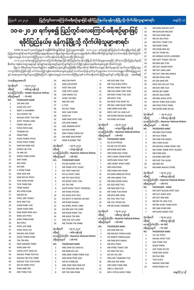 (၁၀-၈-၂၀၂၀) ရက်မှစ၍ ပြည်တွင်းလေကြောင်းခရီးစဉ်များဖြင့် ရခိုင်ပြည်နယ်မှ ရန်ကုန်မြို့သို့ လိုက်ပါခဲ့သူများအနေဖြင့် တိုင်းဒေသကြီး/ ပြည်နယ်များရှိ နီးစပ်ရာ ကျန်းမာရေးဌာနများနှင့် အုပ်ချုပ်ရေး အဖွဲ့အစည်းများသို့ ချက်ချင်းသတင်းပို့ ကျန်းမာရေးစစ်ဆေးမှုခံယူရန် လိုအပ်ပါသည်။