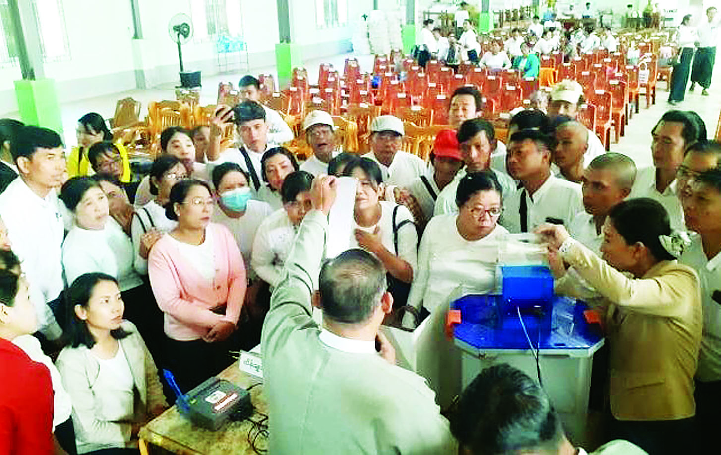 ရန်ကုန်တိုင်းဒေသကြီး နယ်မြေမဲဆန္ဒရှင်ပြည်သူများ မြန်မာအီလက်ထရောနစ်မဲပေးစက်ဖြင့် လက်တွေ့စမ်းသပ်မဲပေး