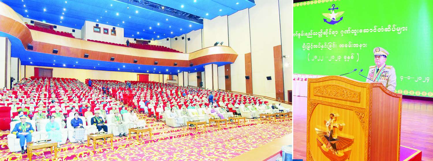 တပ်မတော်စွမ်းရည်သတ္တိဆိုင်ရာ ဂုဏ်ထူးဆောင်တံဆိပ်များ ချီးမြှင့်အပ်နှင်းခြင်းအခမ်းအနားကို ယနေ့ မွန်းလွဲပိုင်းတွင် နေပြည်တော်ရှိ ဇေယျာသီရိဗိမာန်၌ ကျင်းပပြုလုပ်ရာ နိုင်ငံတော်စီမံအုပ်ချုပ် ရေးကောင်စီဥက္ကဋ္ဌ တပ်မတော်ကာကွယ်ရေးဦးစီးချုပ် ဗိုလ်ချုပ်မှူးကြီး သတိုးမဟာသရေစည်သူ သတိုးသီရိသုဓမ္မမင်းအောင်လှိုင် တက်ရောက်မိန့်ခွန်းပြောကြားပြီး ဂုဏ်ထူးဆောင်တံဆိပ်များကို ချီးမြှင့်အပ်နှင်းပေးသည်။