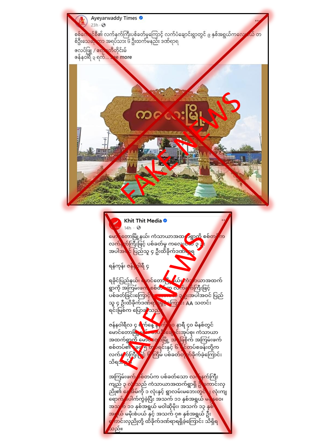 အလားတူ ရခိုင်ပြည်နယ်၊ မောင်တောမြို့နယ်၊ ကံသာယာအထက်ရွာကို ဇန်နဝါရီ ၄ ရက်နေ့တွင် တပ်မတော်ကလက်နက်ကြီးဖြင့် ပစ်ခတ်မှုကြောင့် ကလေးငယ် ၃ ဦးအပါအဝင် ပြည်သူ ၄ ဦး ထိခိုက်ဒဏ်ရာရရှိခဲ့ကြောင်းကို AA သတင်းအရင်းအမြစ်က ပြောကြောင်း Khit Thit Media က သတင်းတု၊ သတင်းအမှားများကို လူမှုကွန်ရက်စာမျက်နှာများတွင် မဟုတ်မမှန် ရေးသားဖြန့်ဝေနေသည်ကိုတွေ့ရှိရသဖြင့် သက်ဆိုင်ရာနယ်မြေမှ လုံခြုံရေးတာဝန်ရှိသူတစ်ဦးထံ ဆက်သွယ်မေးမြန်းချက်အရ မောင်တောမြို့နယ်၊ ကံသာယာ အထက်ရွာကို တပ်မတော်က လက်နက်ကြီးဖြင့် ပစ်ခတ်မှုမရှိခဲ့ကြောင်း၊ AA သောင်းကျန်းသူများမှ လုံခြုံရေးတပ်ဖွဲ့ဝင်များ အလစ်အငိုက်တွင် ကျေးရွာများအတွင်းသို့ လက်နက်ကြီးများဖြင့် ပစ်ခတ်ခဲ့မှုကြောင့် ပြည်သူများထိခိုက်ဒဏ်ရာရရှိခဲ့ခြင်းဖြစ်ကြောင်း သိရှိရပါသည်။