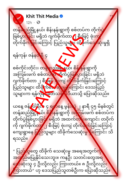 စစ်ကိုင်းတိုင်းဒေသကြီး၊ တန့်ဆည်မြို့နယ်၊ စိန်နန်းကျေးရွာကို ဇန်နဝါရီ ၄ ရက်နေ့တွင် တပ်မတော်က တိုက်ပွဲဖြစ်ပွားခြင်းမရှိဘဲ လေယာဉ် ၂ စီးဖြင့် ဗုံးကျဲတိုက်ခိုက်ခြင်းကြောင့် ကျေးရွာနေပြည်သူများ ထိခိုက်သေဆုံးမှုရှိကြောင်း သတင်းတု၊ သတင်းအမှားများကို Khit Thit Media က လူမှုကွန်ရက်စာမျက်နှာများတွင် မဟုတ်မမှန် ရေးသားဖြန့်ဝေနေသည်ကို တွေ့ရှိရသည်။