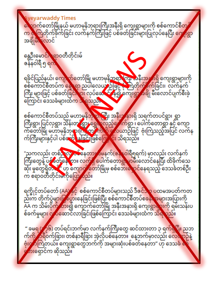 အလားတူ ရခိုင်ပြည်နယ်၊ ကျောက်တော်မြို့၊ မဟာမုနိဘုရားကြီးအနီးရှိ ကျေးရွာများကို တပ်မတော်မှ နေ့၊ ည လေယာဉ်ဖြင့် ဗုံးကြဲတိုက်ခိုက်ခြင်း၊ လက်နက်ကြီးများဖြင့် ပစ်ခတ်ခြင်းများ လုပ်ဆောင်နေ၍ ကျေးရွာအချို့ မီးလောင်ပျက်စီးခဲ့ကြောင်း သတင်းတု၊ သတင်းမှားများကို လူမှုကွန်ရက်စာမျက်နှာများတွင် မဟုတ်မမှန် ရေးသားဖြန့်ဝေနေသည်ကို တွေ့ရှိရသည်။