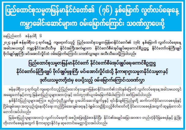 ပြည်ထောင်စုသမ္မတမြန်မာနိုင်ငံတော်၏ (၇၆) နှစ်မြောက် လွတ်လပ်ရေးနေ့ ကမ္ဘာ့ခေါင်းဆောင်များက ဝမ်းမြောက်ကြောင်း သဝဏ်လွှာပေးပို့ 01/07/2024