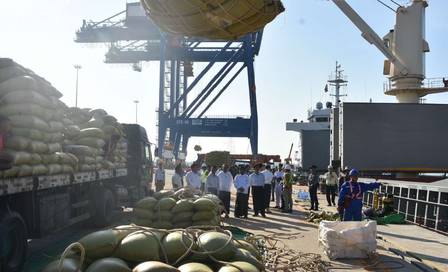 စီးပွားရေးနှင့်ကူးသန်းရောင်းဝယ်ရေးဝန်ကြီးဌာန ပြည်ထောင်စုဝန်ကြီး ဦးထွန်းအုံသည် တာဝန်ရှိသူများနှင့်အတူ ယနေ့နံနက်ပိုင်းတွင် ရန်ကုန်တိုင်းဒေသကြီး အလုံဆိပ်ကမ်းသို့ ရောက်ရှိပြီး MV. Yong Sheng 151 သင်္ဘောပေါ်သို့ Tun Myat Thu ကုမ္ပဏီလီမိတက် Hey Day Energy ကုမ္ပဏီလီမိတက်၊ Asia Empower ကုမ္ပဏီလီမိတက်၊ Myanmar Pulses Zone Co., Ltd. တို့က ဖိလစ်ပိုင်နိုင်ငံသို့ တင်ပို့မည့် ပြောင်းစေ့တန် ၁၁၅၀၀ တင်ဆောင်နေမှုကို ကြည့်ရှုစစ်ဆေးသည်။