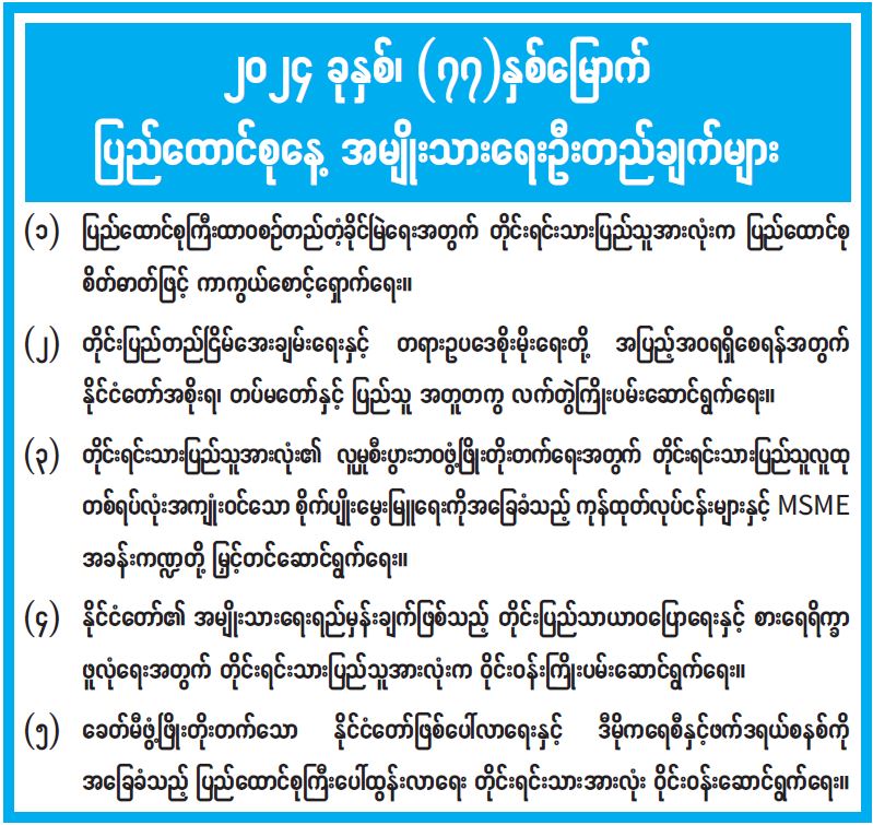 (၃) တိုင်းရင်းသားပြည်သူအားလုံး၏ လူမှုစီးပွားဘဝဖွံ့ဖြိုးတိုးတက်ရေးအတွက် တိုင်းရင်းသားပြည်သူလူထုတစ်ရပ်လုံး အကျုံးဝင်သော စိုက်ပျိုးမွေးမြူရေးကို အခြေခံသည့် ကုန်ထုတ်လုပ်ငန်း များနှင့် MSME အခန်းကဏ္ဍတို့ မြှင့်တင်ဆောင်ရွက်ရေး။