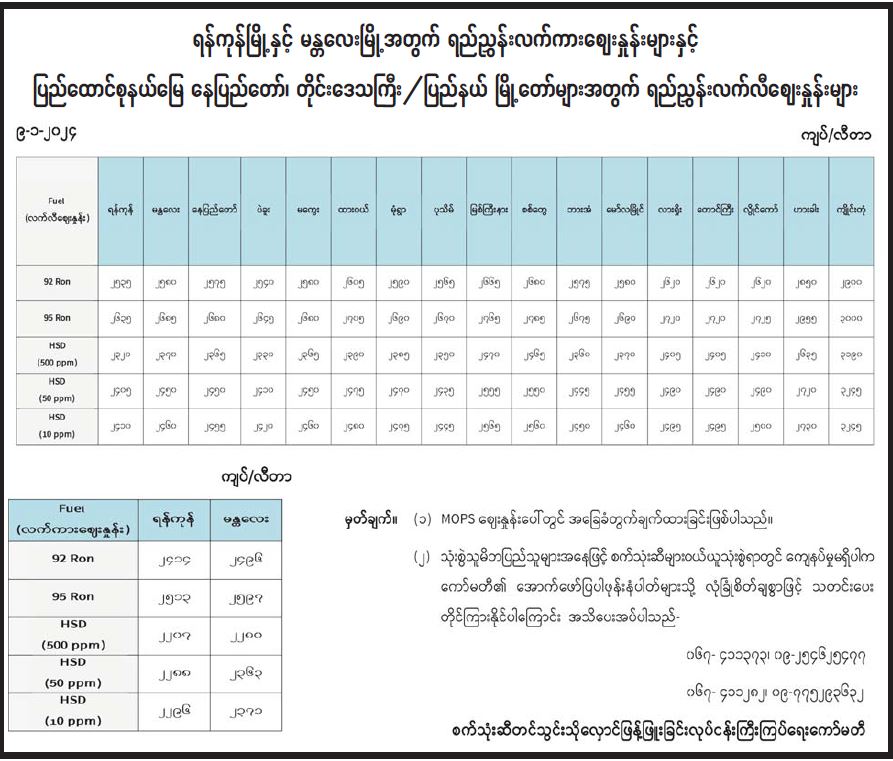 ရန်ကုန်မြို့နှင့် မန္တလေးမြို့အတွက် ရည်ညွှန်းလက်ကားဈေးနှုန်းများနှင့် ပြည်ထောင်စုနယ်မြေ နေပြည်တော်၊ တိုင်းဒေသကြီး/ပြည်နယ် မြို့တော်များအတွက် ရည်ညွှန်းလက်လီဈေးနှုန်းများ 01/09/2024