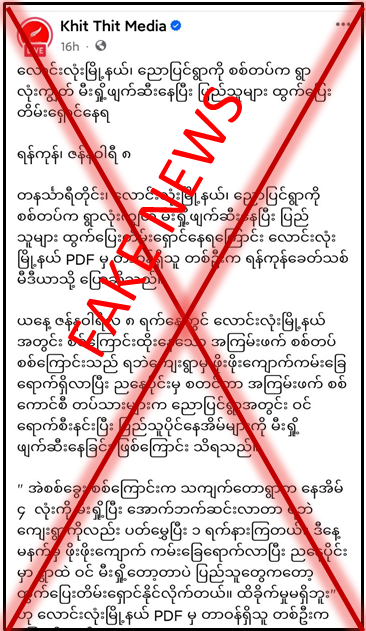 တနင်္သာရီတိုင်းဒေသကြီး၊ လောင်းလုံမြို့နယ်၊ ညောပြင်ရွာကို ဇန်နဝါရီ ၈ ရက်နေ့တွင် လုံခြုံရေးတပ်ဖွဲ့ဝင်များက ရွာလုံးကျွတ်မီးရှို့ဖျက်ဆီးနေပြီး ပြည်သူများ ထွက်ပြေးတိမ်းရှောင်နေရကြောင်း သတင်းတု၊ သတင်းအမှားများကို Khit Thit Media က လူမှုကွန်ရက်စာမျက်နှာများတွင် မဟုတ်မမှန်ရေးသား ဖြန့်ဝေနေသည်ကို တွေ့ရှိရသည်။