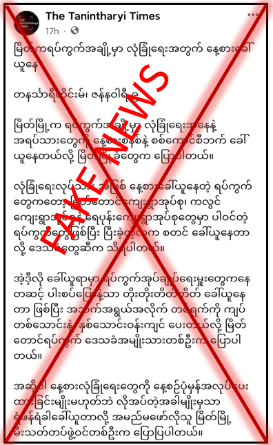 တရားမဝင်ပြည်ဖျက်မီဒီယာများမှ ကောလာဟလသတင်းများကို မဟုတ်မမှန် လုပ်ကြံရေးသားပြီး ပြည်သူများ၏ အသက်အိုးအိမ်စည်းစိမ်ဥစ္စာကို ကာကွယ်စောင့်ရှောက် နေသည့် လုံခြုံရေးတပ်ဖွဲ့ဝင်များအား အထင်အမြင်လွဲမှားစေရန် သတင်းတု၊ သတင်းအမှားများကို ရေးသားဖြန့်ဝေနေခြင်းသာဖြစ်ကြောင်း သတင်းရရှိပါသည်။