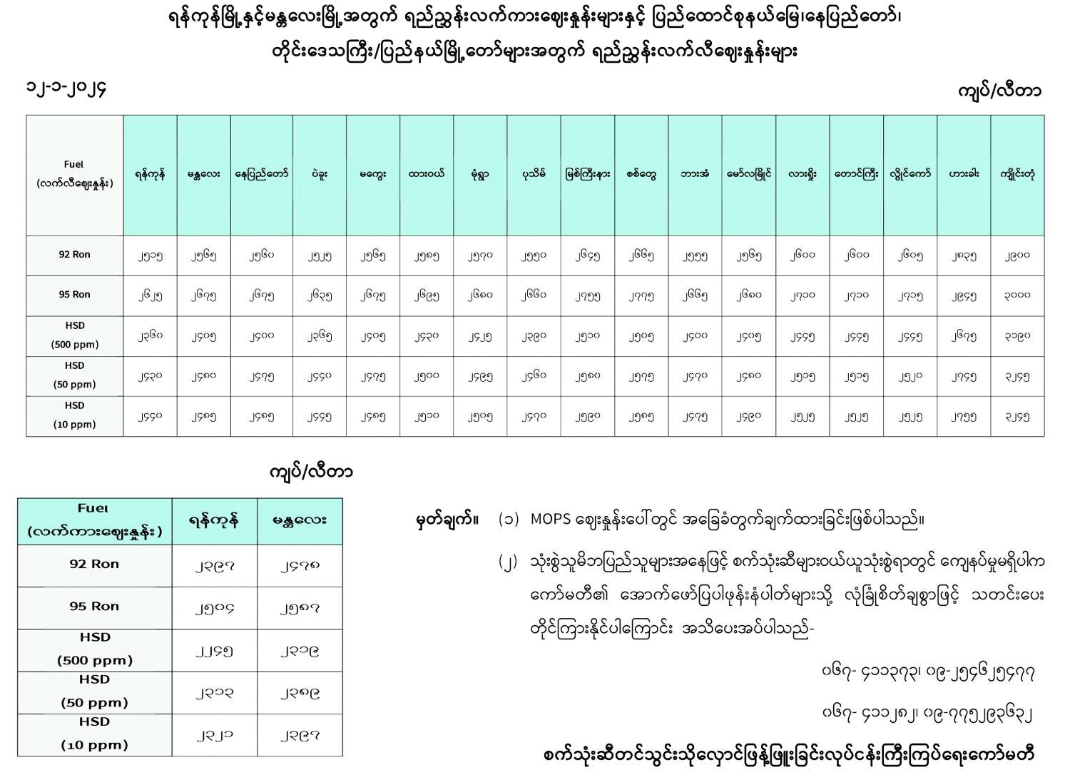 ရန်ကုန်မြို့နှင့် မန္တလေးမြို့အတွက် ရည်ညွှန်းလက်ကားဈေးနှုန်းများနှင့် ပြည်ထောင်စုနယ်မြေ နေပြည်တော်၊ တိုင်းဒေသကြီး/ ပြည်နယ် မြို့တော်များအတွက် ရည်ညွှန်းလက်လီဈေးနှုန်းများ 01/12/2024