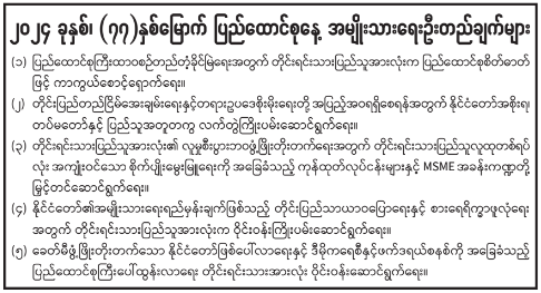 (၃) တိုင်းရင်းသားပြည်သူအားလုံး၏ လူမှုစီးပွားဘဝဖွံ့ဖြိုးတိုးတက်ရေးအတွက် တိုင်းရင်းသားပြည်သူလူထုတစ်ရပ်လုံး အကျုံးဝင်သော စိုက်ပျိုးမွေးမြူရေးကို အခြေခံသည့် ကုန်ထုတ်လုပ်ငန်းများနှင့် MSME အခန်းကဏ္ဍတို့ မြှင့်တင်ဆောင်ရွက်ရေး။