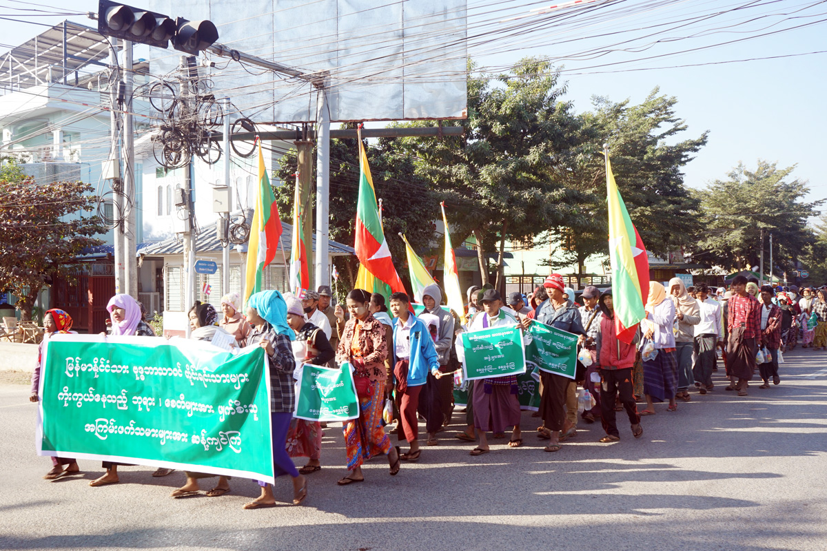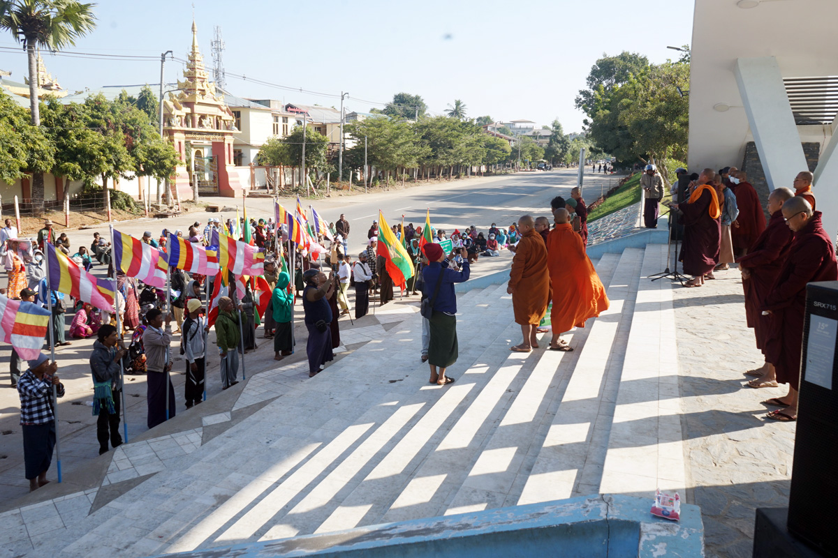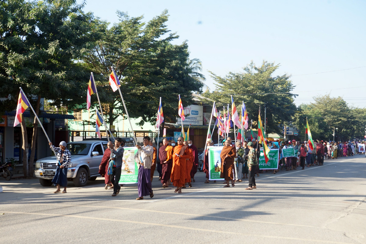 ရှေးဦးစွာ ဆရာတော်သံဃာတော်များနှင့် ပြည်သူစုစုပေါင်း (၇၀၀)ဦးခန့်က မကွေးခရိုင် အားကစားကွင်းရှေ့မှ စတင်၍ အ.ထ.က(၁)လမ်းမှ ကန်သာမင်္ဂလာကန်တော်အထိ “သာသနာကို ဖျက်ဆီးနေသော အကြမ်းဖက်သူပုန်များအား ရှင်းလင်းရေး”၊ “ဗုဒ္ဓသာသနာအား စော်ကားဖျက်စီးနေသော အကြမ်းဖက်သူပုန်မှန်သမျှ ဆန့်ကျင်ကြ”၊ “ဘုရားစေတီများအား ဖျက်ဆီးနေသည့် လူသတ်အကြမ်းဖက် သူပုန်မှန်သမျှ ကျဆုံးပါစေ” စသည့် စာသာများပါဝင်သည့် ဗီနိုင်များကိုင်ဆောင်၍ ကြွေးကြော်ကာ ကန့်ကွက်ရှုတ်ချခဲ့ကြသည်။