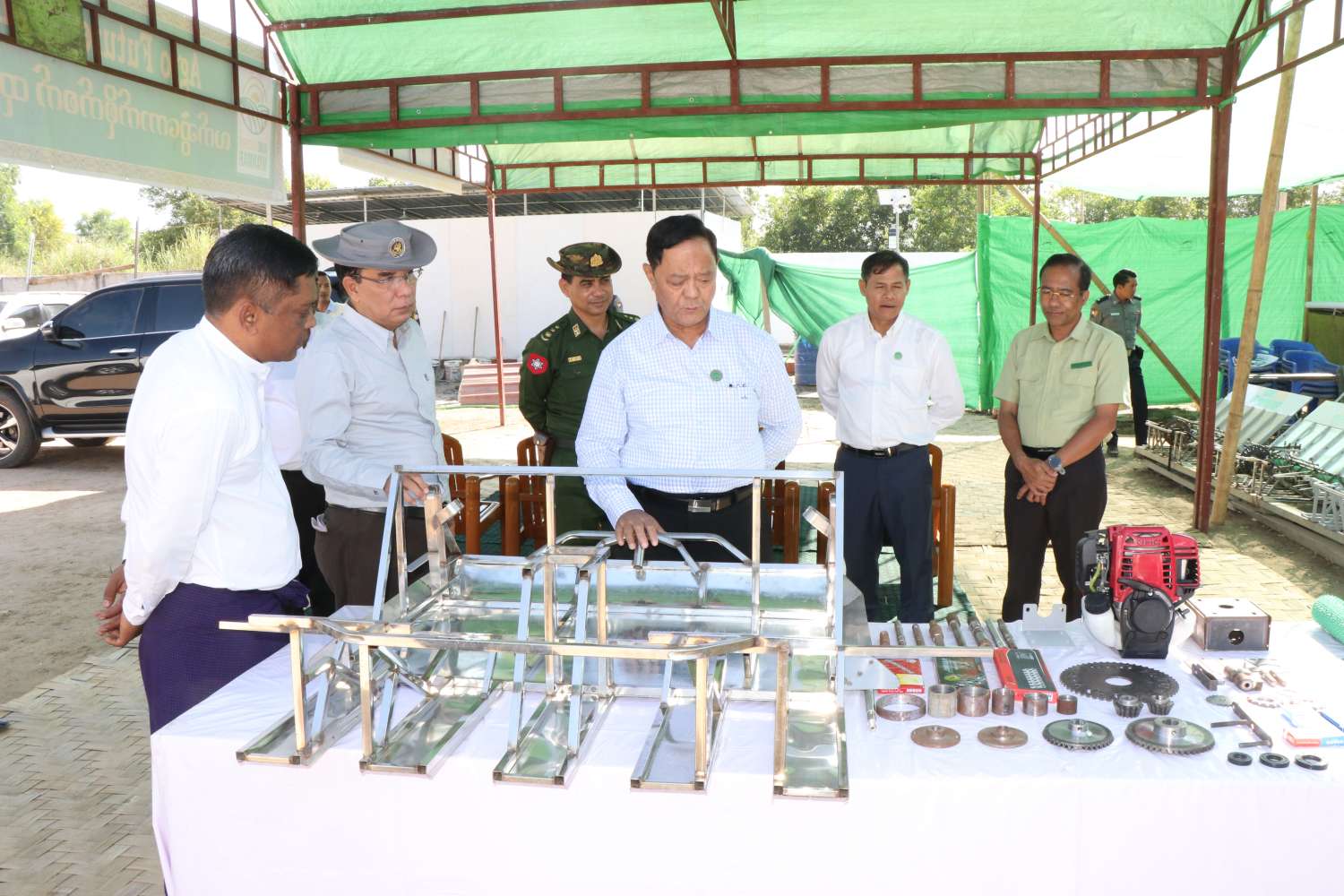 ထို့နောက် ပြည်ထောင်စုဝန်ကြီး ဦးလှမိုး၊ တိုင်းဒေသကြီးဝန်ကြီးချုပ်တို့က ပဲခူးမြို့နယ်၊ ရွာသစ်ကျေးရွာအတွက် မြစိမ်းရောင်ကျေးရွာစီမံကိန်း မတည်ရင်းနှီးငွေကျပ် (၃၂၈) သိန်းကို ကျေးရွာကော်မတီဝင်များထံ လွှဲပြောင်းပေးအပ်ပြီး အစုအဖွဲ့များ ဖွဲ့စည်း၍ Green House စနစ်ဖြင့် စိုက်ပျိုးထားသည့် ခရမ်းချဉ်၊ ငရုပ်၊ ဆလပ် ဟော်လန်မျိုး ဟင်းသီးဟင်းရွက်များ စိုက်ပျိုးထားရှိမှု၊ ပဲခူးတိုင်းဒေသကြီးအတွင်း မဲခေါင် - လန်ချန်း စီမံကိန်းဖြင့် ဆောင်ရွက်ခဲ့သော ဒေသထွက်ကုန်များ၊ မြစိမ်းရောင်ကျေးရွာစီမံကိန်းနှင့် အသက်မွေးဝမ်းကျောင်းလုပ်ငန်း သင်တန်းများမှ ထွက်ရှိသော ဒေသထွက်ကုန်များ ခင်းကျင်းပြသထားရှိမှု ကိုကြည့်ရှုစစ်ဆေးသည်။