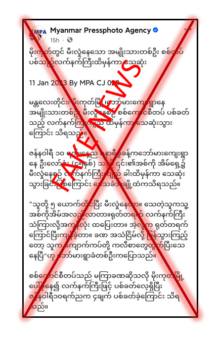 မန္တလေးတိုင်းဒေသကြီး၊ မိုးကုတ်မြို့ရှိ ဘော်မားကျေးရွာမှ အမျိုးသားတစ်ဦးမီးလှုံနေစဉ် တပ်မတော်ကပစ်ခတ်သည့် လက်နက်ကြီးကျည်ထိမှန်ကာ သေဆုံးခဲ့သည့်ဖြစ်စဉ် ဇန်နဝါရီ ၁၀ ရက်နေ့ကဖြစ်ပွားခဲ့ကြောင်း ကောလာဟလ သတင်းအမှားများကို တရားမဝင်ပြည်ဖျက်မီဒီယာများက လူမှုကွန်ရက်စာမျက်နှာများတွင် လုပ်ကြံရေးသား ဖြန့်ဝေနေသည်ကို တွေ့ရှိရသည်။