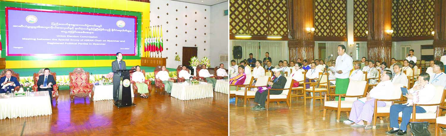 ဆက်လက်၍ ရန်ကုန်တိုင်း ဒေသကြီးအစိုးရအဖွဲ့ရုံး၊ မင်္ဂလာခန်းမ၌ ပြည်ထောင်စုရွေးကောက်ပွဲကော်မရှင်၊ အာဆီယံဥက္ကဋ္ဌ၏ မြန်မာနိုင်ငံဆိုင်ရာ အထူးကိုယ်စားလှယ်နှင့် မှတ်ပုံတင်ခွင့်ပြုပြီး နိုင်ငံရေးပါတီများတွေ့ဆုံခဲ့ကြပြီး ရွေးကောက်ပွဲဆိုင်ရာ ကိစ္စရပ်များနှင့်စပ်လျဉ်း၍လည်းကောင်း၊ နိုင်ငံရေးပါတီဆိုင်ရာကိစ္စရပ်များနှင့် စပ်လျဉ်း၍လည်းကောင်း မေးမြန်းဆွေးနွေးခဲ့ကြသည်။
