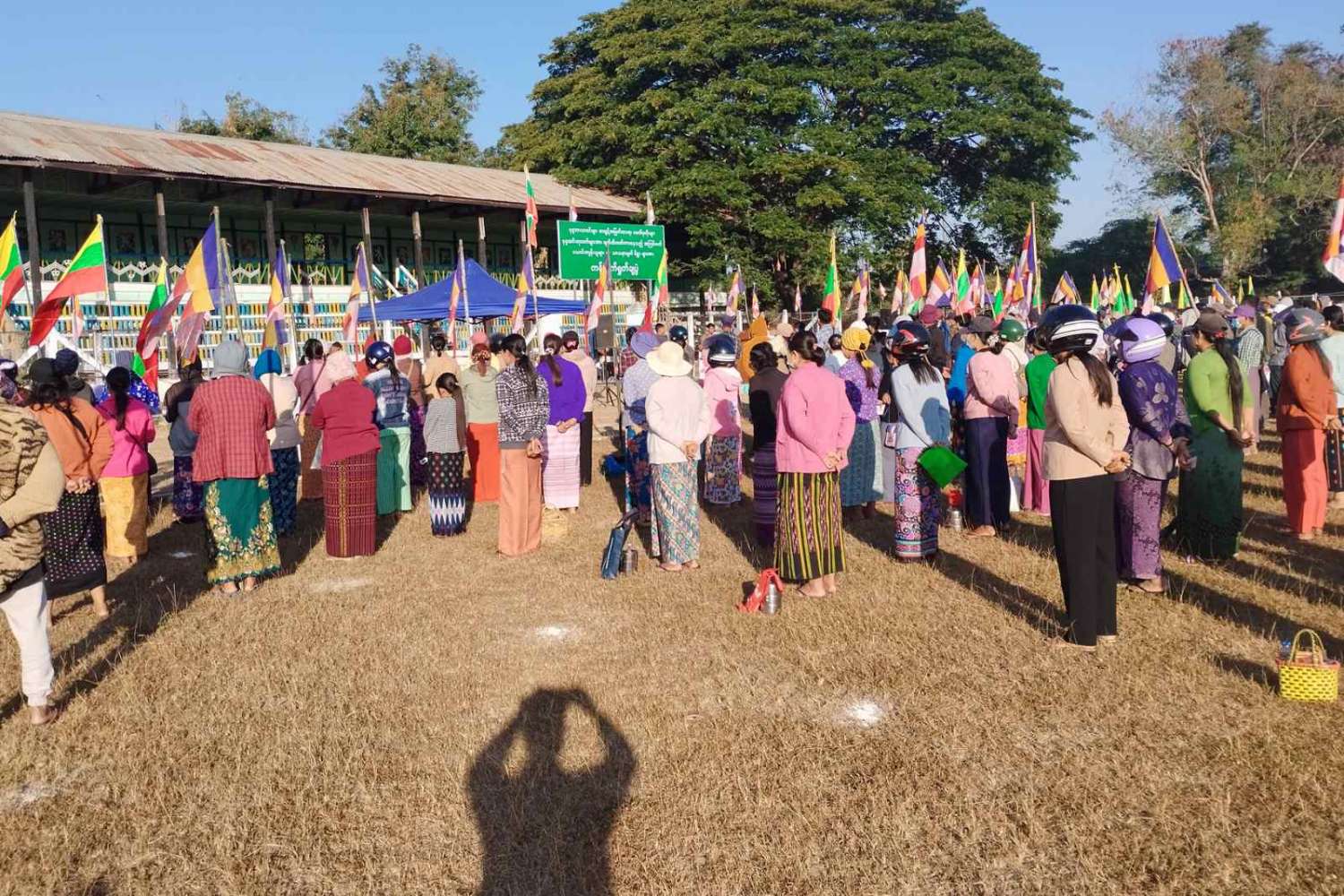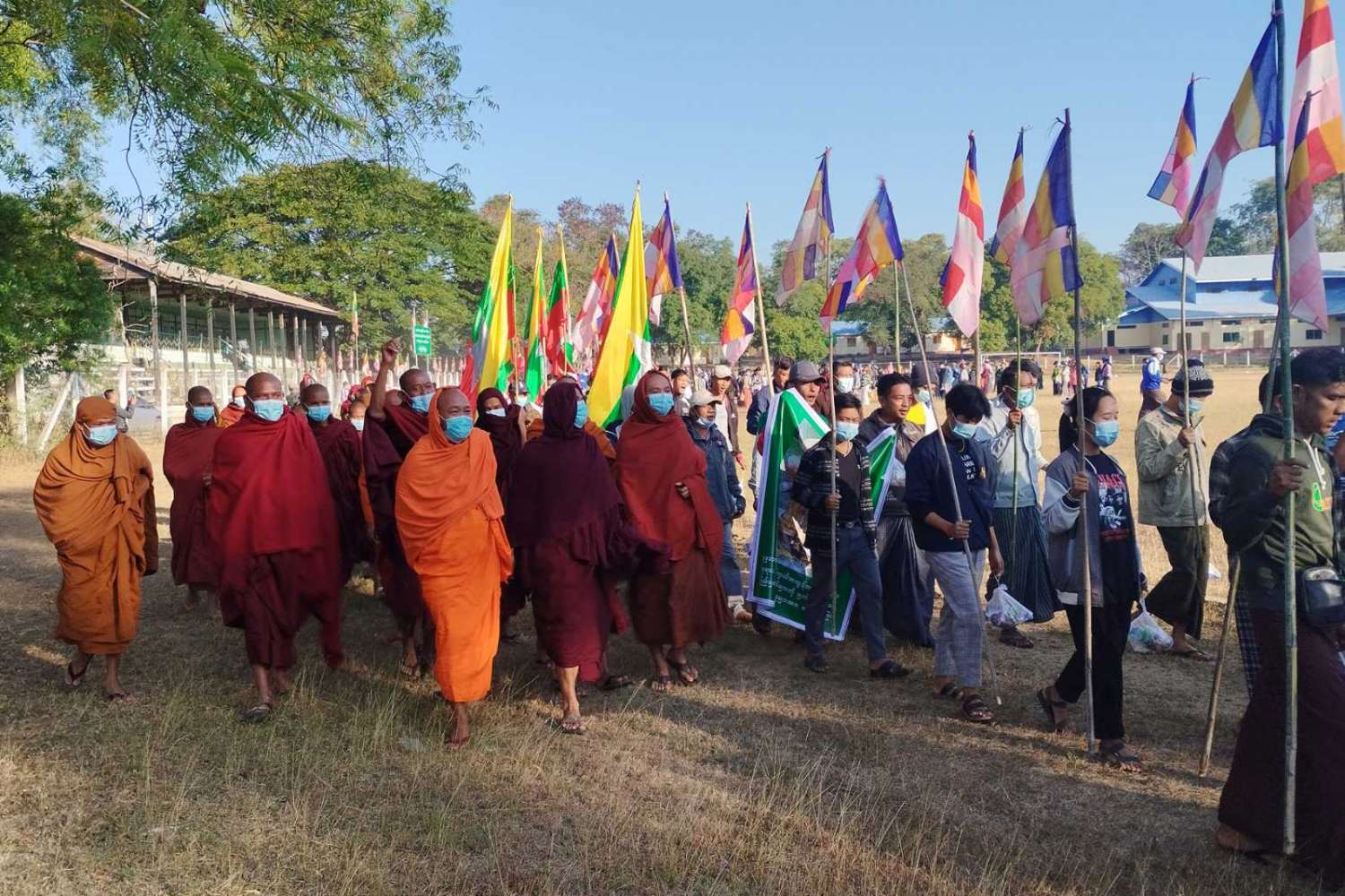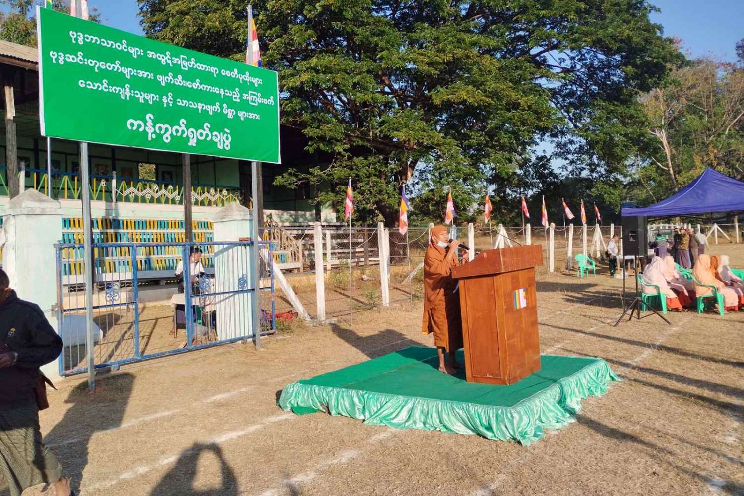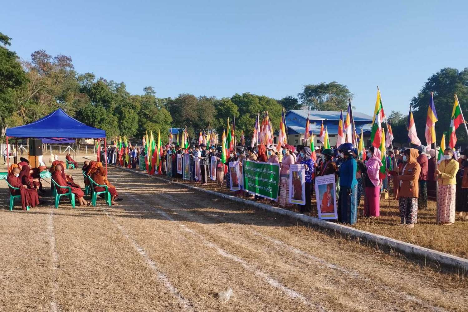 ရှေးဦးစွာ ဆရာတော်သံဃာတော်များနှင့် ပြည်သူစုစုပေါင်း(၈၅၀)ဦးခန့်က အားကစားကွင်း အတွင်းနေရာယူ၍ ဘောဓိကန်ကျောင်းဆရာတော်ဦးရေဝတနှင့် ဦးဇော်ဇော်(ခ)ဦး ဝေမောင်းတို့က ဟောပြောပြီး သာသနာဖျက်အကြမ်းဖက်သမားများ အလိုမရှိ၊ အကြမ်းဖက် သောင်းကျန်းသူများအား ကန့်ကွက်ရှုတ်ချသည့် ဗီနိုင်းများကိုင်ဆောင်ကာ ပြည်ဖျက်မိစ္ဆာ အကြမ်းဖက်ဝါဒီများ ပပျောက်ရေးဒို့အရေး၊ ပြည်သူတွေရဲ့ အသက်ကိုရောင်းဒေါ်လာ တောင်းစားနေသည့် ခွေးဝဲစားပြည်ဖျက်မိစ္ဆာများ(အလိုမရှိ) ပြည်ပဩဇာခံ ပြည်ဖျက်မိစ္ဆာ အကြမ်းဖက်များ (အလိုမရှိ) အကောက်ကြံ ခလောက်ဆန် လက်နက်ကိုင်သောင်းကျန်း သူများ၏ နောက်ကွယ်မှ ကြိုးကိုင်နေသူများအား (ဆန့်ကျင်ကြ) လမ်းတံတားများကို ဖျက်ဆီး၊ ဒေသခံ ပြည်သူများ၏ လူမှုစီးပွားဘဝကို ဖျက်ဆီးနေသည့် မျောက်သုံးကောင်ရှင်းလင်းရေး( ဒို့အရေး)စသည့် ကြွေးကြော်သံများကြွေးကြော်ပြီး ငြိမ်းချမ်းလူစုခွဲသွားကြောင်းသိရှိရသည်။