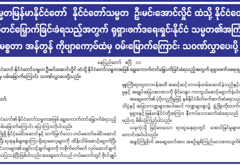နိုင်ငံတော်၏ စီးပွားရေးဦးတည်ချက် (၃) ရပ်အနက် ပထမဦးတည်ချက်ဖြစ်သည့် တိုင်းပြည်သာယာဝပြောရေးနှင့် စားရေရိက္ခာဖူလုံရေးတို့အတွက် တိုင်းရင်းသားပြည်သူတစ်ရပ်လုံးနှင့် အကျုံးဝင်သော စိုက်ပျိုးရေးနှင့် မွေးမြူရေးကို ခေတ်မီနည်းစနစ်များဖြင့် တိုးတက်အောင်ဆောင်ရွက်ပြီး အခြားစီးပွားရေးကဏ္ဍများကိုလည်း ဘက်စုံဖွံ့ဖြိုးတိုးတက်အောင် တည်ဆောက်ရန်အတွက် စိုက်ပျိုးရေးနှင့် မွေးမြူရေးထုတ်ကုန်များ ပိုမိုစိုက်ပျိုး၊ ထုတ်လုပ်၊ တိုးတက်တင်ပို့ဆောင်ရွက်သွားရန် တိုက်တွန်းအပ်ပါသည်။