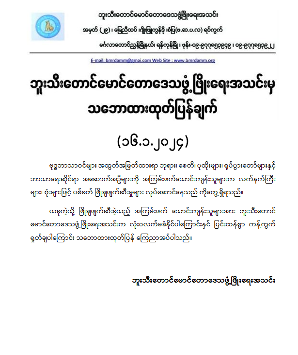 ယခုကဲ့သို့ ဖြိုချဖျက်ဆီးခဲ့သည့် အကြမ်းဖက် သောင်းကျန်းသူများအား ဘူးသီးတောင် မောင်တောဒေသဖွံ့ဖြိုးရေးအသင်းက လုံးဝလက်မခံနိုင်ပါကြောင်းနှင် ပြင်းထန်စွာ ကန့်ကွက် ရှုတ်ချပါကြောင်း သဘောထားထုတ်ပြန် ကြေညာအပ်ပါသည်။