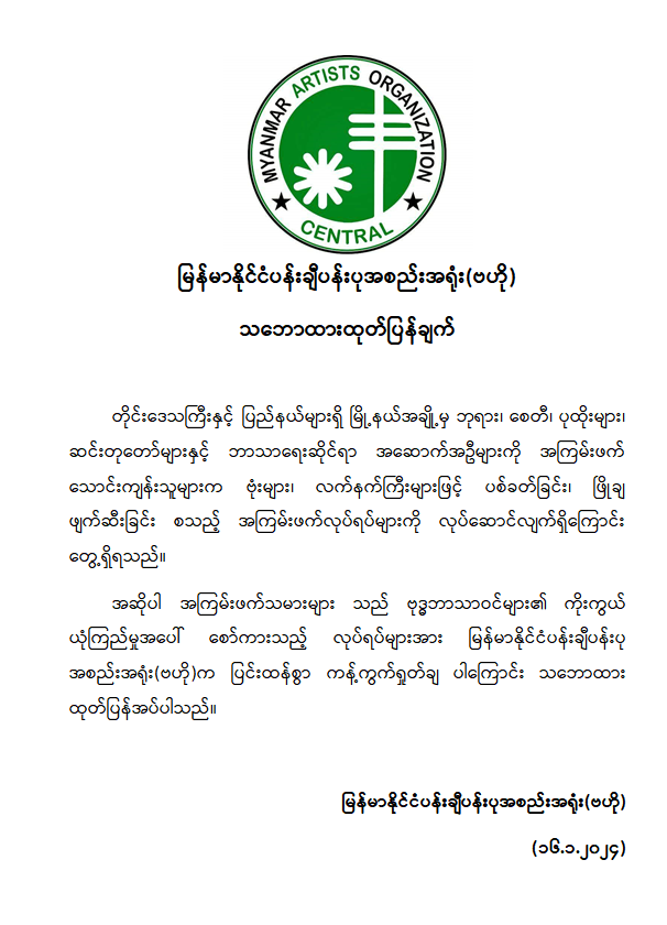 အဆိုပါ အကြမ်းဖက်သမားများသည် ဗုဒ္ဓဘာသာဝင်များ၏ ကိုးကွယ်ယုံကြည်မှုအပေါ် စော်ကားသည့် လုပ်ရပ်များအား မြန်မာနိုင်ငံပန်းချီပန်းပု အစည်းအရုံး(ဗဟို)က ပြင်းထန်စွာ ကန့်ကွက်ရှုတ်ချပါကြောင်း သဘောထားထုတ်ပြန်အပ်ပါသည်။