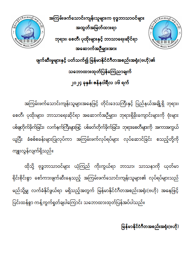 ထိုသို့ ဗုဒ္ဓဘာသာဝင်များ ယုံကြည် ကိုးကွယ်ရာ ဘာသာ၊ သာသနာကို ယုတ်မာ ရိုင်းစိုင်းစွာ စော်ကားဖျက်ဆီးနေသည့် အကြမ်းဖက်သောင်းကျန်းသူများ၏ လုပ်ရပ်များသည် မည်သို့မျှ လက်ခံနိုင်ဖွယ်ရာ မရှိသည့်အတွက် မြန်မာနိုင်ငံဂီတအစည်းအရုံး(ဗဟို) အနေဖြင့် ပြင်းထန်စွာ ကန့်ကွက်ရှုတ်ချပါကြောင်း သဘောထားထုတ်ပြန်အပ်ပါသည်။