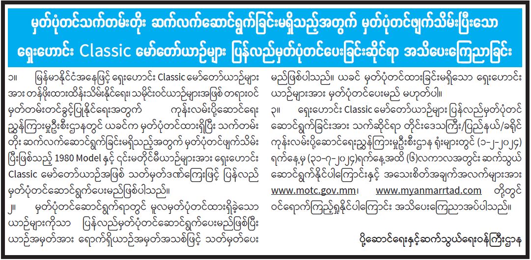 မှတ်ပုံတင်သက်တမ်းတိုး ဆက်လက်ဆောင်ရွက်ခြင်းမရှိသည့်အတွက် မှတ်ပုံတင်ဖျက်သိမ်းပြီးသော ရှေးဟောင်း Classic မော်တော်ယာဉ်များ ပြန်လည်မှတ်ပုံတင်ပေးခြင်းဆိုင်ရာ အသိပေးကြေညာခြင်း 01/18/2024
