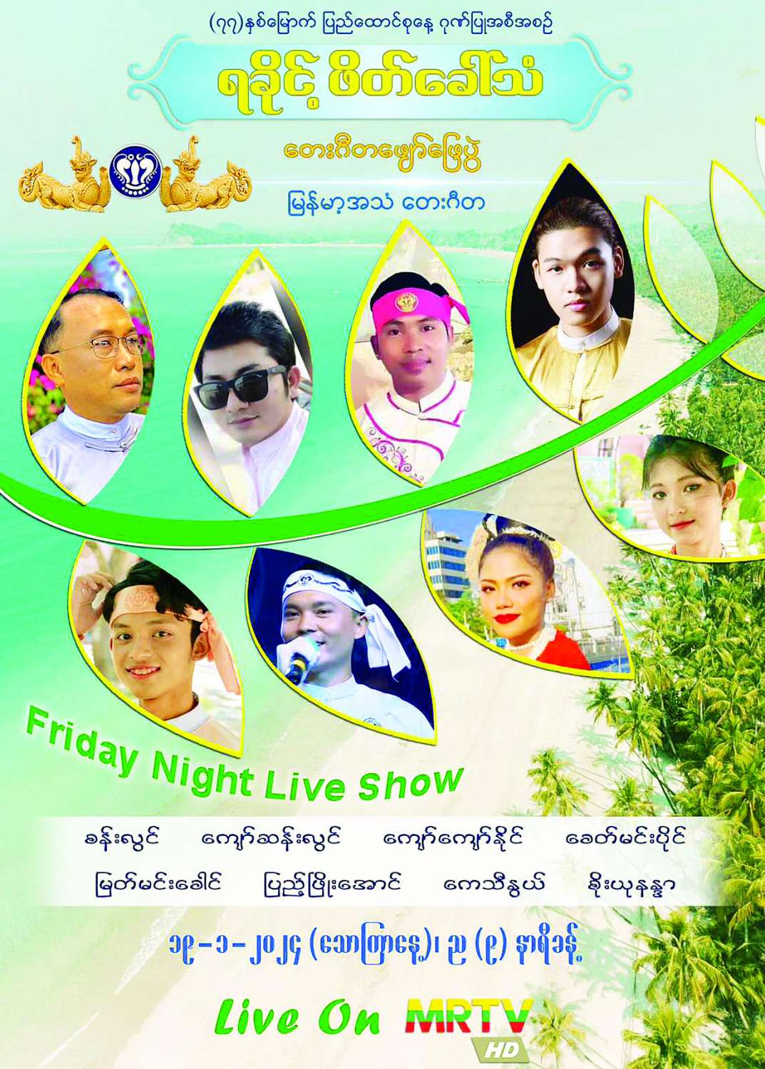 (၇၇) နှစ်မြောက် ပြည်ထောင်စုနေ့ကို ဂုဏ်ပြုသောအားဖြင့် “ရခိုင့်ဖိတ်ခေါ်သံ” တေးဂီတဖျော်ဖြေပွဲကို ဇန်နဝါရီ ၁၉ ရက် (သောကြာနေ့) ည ၉ နာရီခန့်တွင် မြန်မာ့အသံနှင့် ရုပ်မြင်သံကြား၏ MRTV-HD Channel မှ Friday Night Live Show အဖြစ် တိုက်ရိုက်ထုတ်လွှင့် ပြသမည်ဖြစ်သည်။