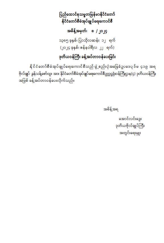 ဒုတိယဝန်ကြီး ခန့်အပ်တာဝန်ပေးခြင်း 01/22/2024 ပြည်ထောင်စုသမ္မတမြန်မာနိုင်ငံတော် နိုင်ငံတော်စီမံအုပ်ချုပ်ရေးကောင်စီ အမိန့်အမှတ်၊ ၈ / ၂၀၂၄ ၁၃၈၅ ခုနှစ်၊ ပြာသိုလဆန်း ၁၂ ရက် (၂၀၂၄ ခုနှစ်၊ ဇန်နဝါရီလ ၂၂ ရက်) ဒုတိယဝန်ကြီး ခန့်အပ်တာဝန်ပေးခြင်း