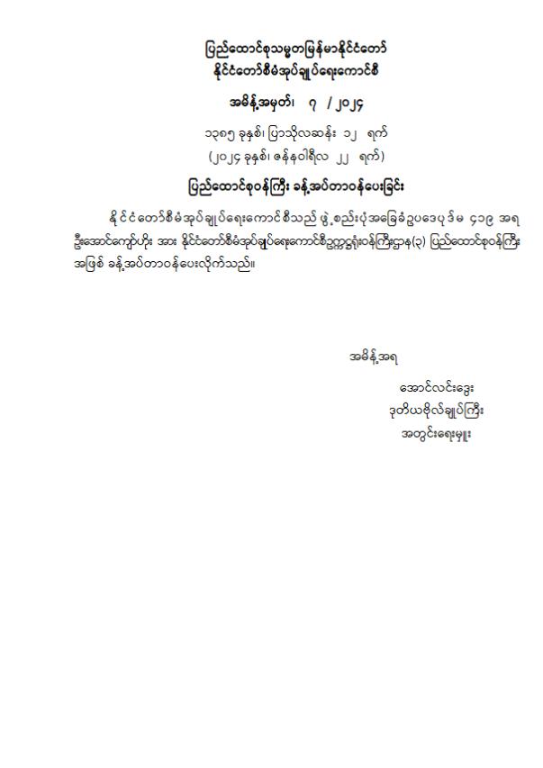 ပြည်ထောင်စုဝန်ကြီး ခန့်အပ်တာဝန်ပေးခြင်း 01/22/2024 ပြည်ထောင်စုသမ္မတမြန်မာနိုင်ငံတော် နိုင်ငံတော်စီမံအုပ်ချုပ်ရေးကောင်စီ အမိန့်အမှတ်၊ ၇ / ၂၀၂၄ ၁၃၈၅ ခုနှစ်၊ ပြာသိုလဆန်း ၁၂ ရက် (၂၀၂၄ ခုနှစ်၊ ဇန်နဝါရီလ ၂၂ ရက်) ပြည်ထောင်စုဝန်ကြီး ခန့်အပ်တာဝန်ပေးခြင်း
