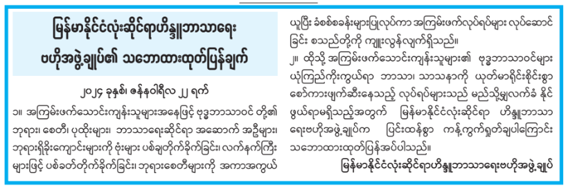၂။ ထိုသို့ အကြမ်းဖက်သောင်းကျန်းသူများ၏ ဗုဒ္ဓဘာသာဝင်များ ယုံကြည်ကိုးကွယ်ရာ ဘာသာ၊ သာသနာကို ယုတ်မာရိုင်းစိုင်းစွာ စော်ကားဖျက်ဆီးနေသည့် လုပ်ရပ်များသည် မည်သို့မျှလက်ခံနိုင်ဖွယ်ရာမရှိသည့်အတွက် မြန်မာနိုင်ငံလုံးဆိုင်ရာ ဟိန္ဒူဘာသာရေးဗဟိုအဖွဲ့ချုပ်က ပြင်းထန်စွာ ကန့်ကွက်ရှုတ်ချပါကြောင်း သဘောထားထုတ်ပြန်အပ်ပါသည်။